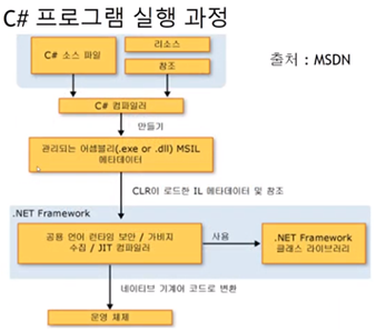C# 언어 -> 컴파일 -> MSIL -> CLR -> 실행