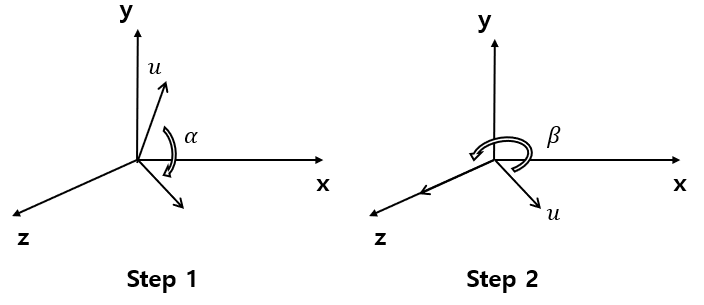 Step 2의 Step2. y축 중심으로 β만큼 회전해서 z축에 맞춰주기
