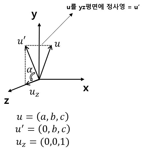 u를 yz평면에 정사영시키면 u' 벡터가 나오고,