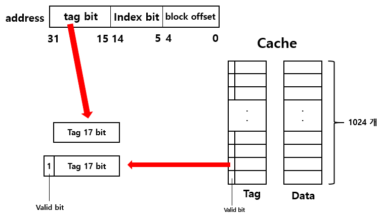 address의 tag bit 와 Cache에 있는 tag bit가 같은지 검사한다.