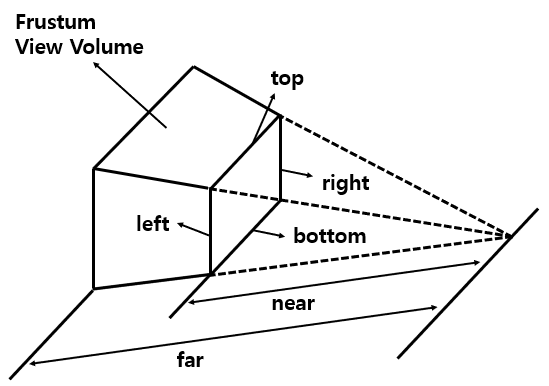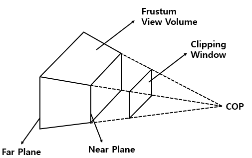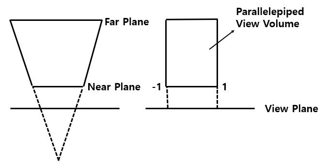 왼쪽 Frustum View Volume에서 Perspective Mapping을 통해 오른쪽의 Parallelepiped View Volume을 만들었다고 하자.