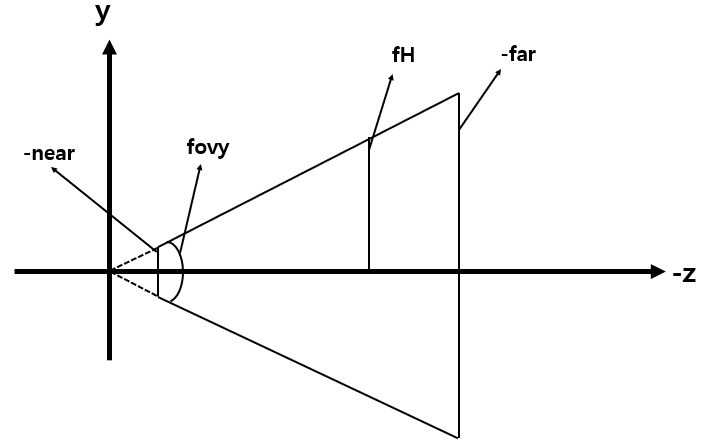 OpenGL 에서는 field of view Y (fovy) 라는 각도로 화면의 높이와 넓이를 구하게 됨.