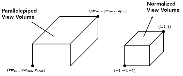 그리고 Parallelepiped View Volume 을 Normalized View Volume 으로 만들어야 하는데,