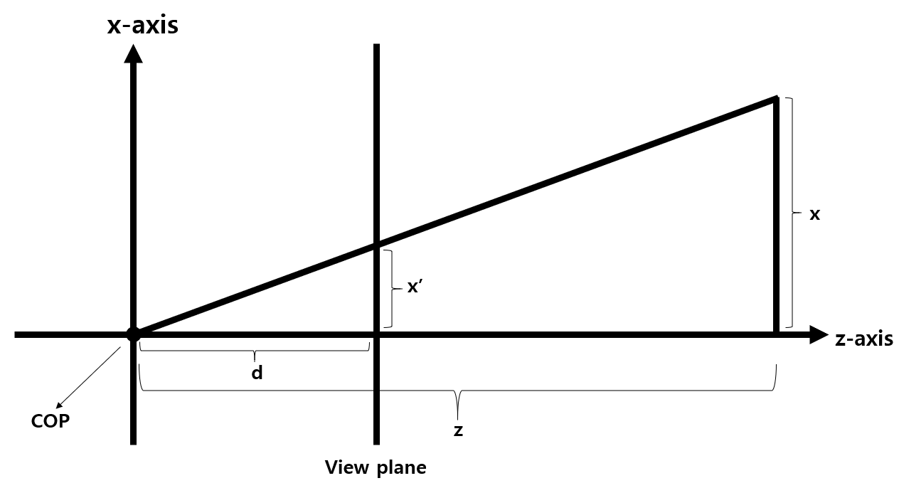 만약 z의 위치에 어떤 물체가 있고, 이를 View plane에 크기에 맞춰 그리려면 닮은 비를 이용하자.