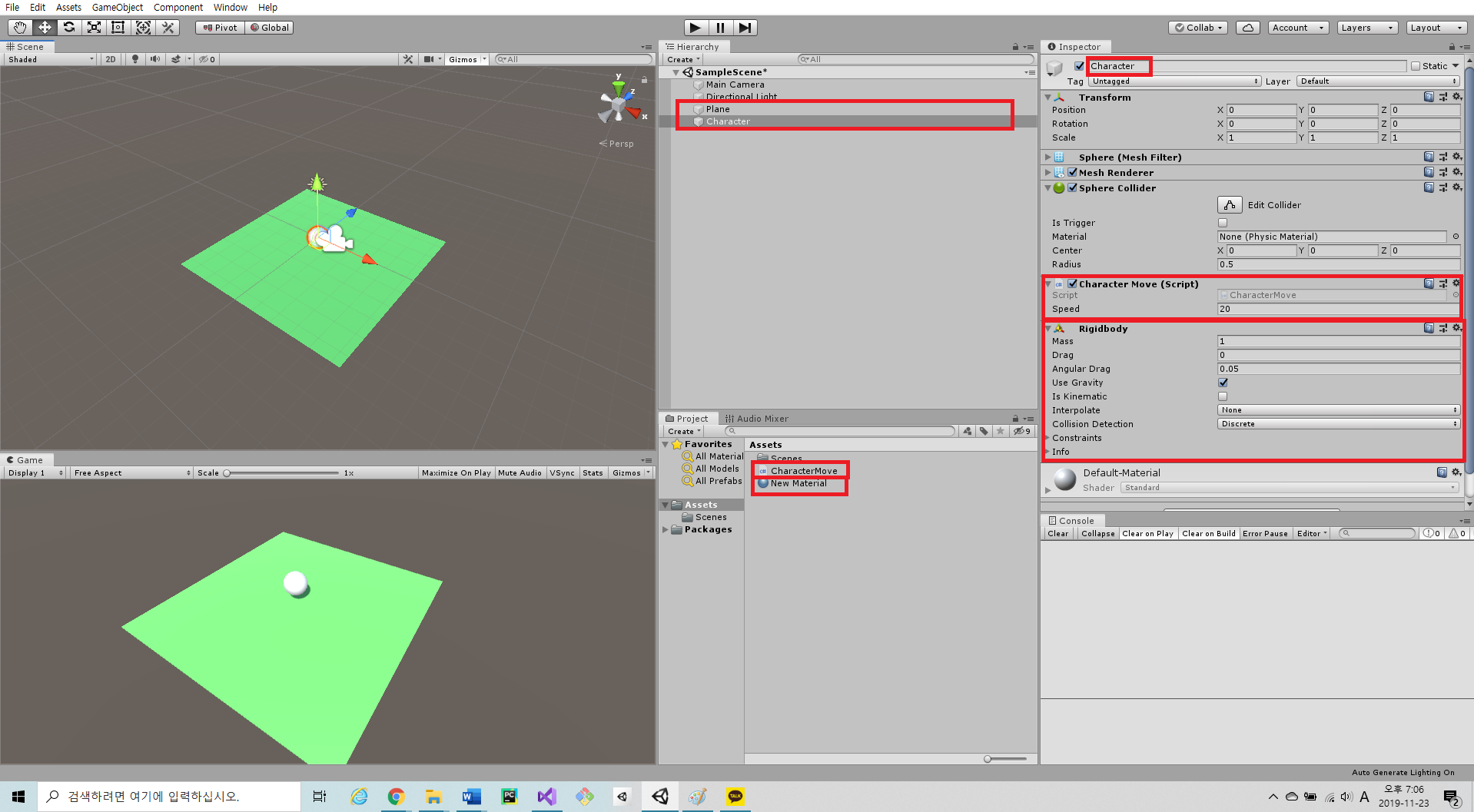 기본 셋팅으로 움직일 캐릭터(Sphere)와 땅(Plane),