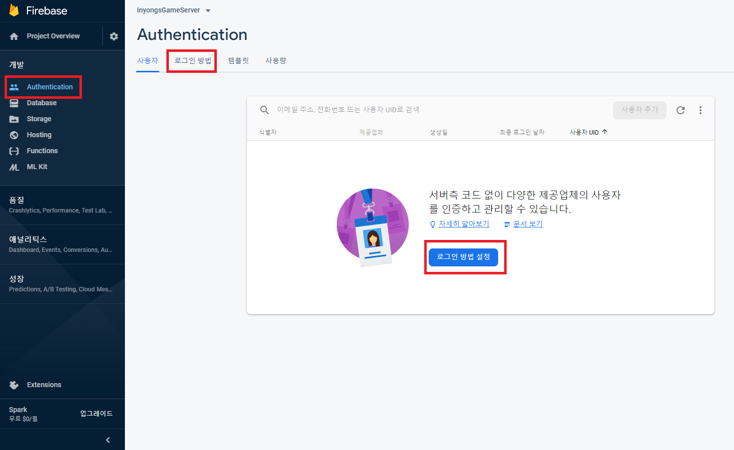 그리고 Firebase에서 Authentication탭에 들어갑니다.