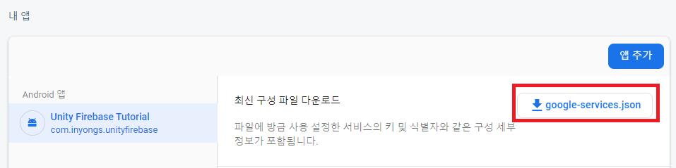 바로 google-services.json파일에 저장됩니다. 이 파일을 유니티에 삽입해주면 변경사항을 적용할 수 있습니다.