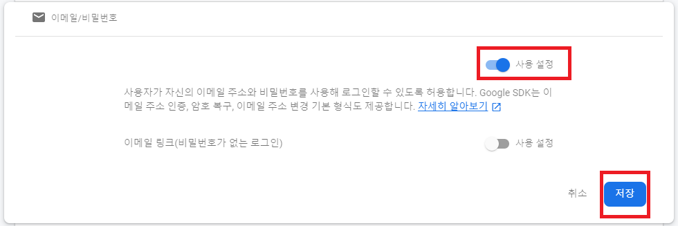 이메일/비밀번호를 사용한다고 체크해주고 저장을 해줍니다.
