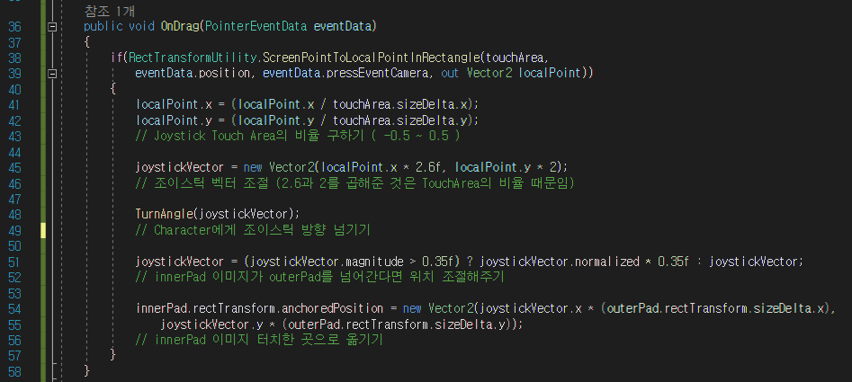 그래서 바꾸어진 Local 터치좌표를 이용하여 조이스틱 벡터를 단위벡터로 계산하고, Character에게 벡터를 넘기고, innerPad의 이미지를 그려주었습니다.