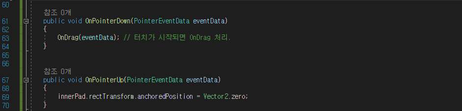 터치가 시작되면 OnDrag처리를 해주었고, 터치가 종료되면 innerPad의 위치를 원위치 시켜주었습니다.