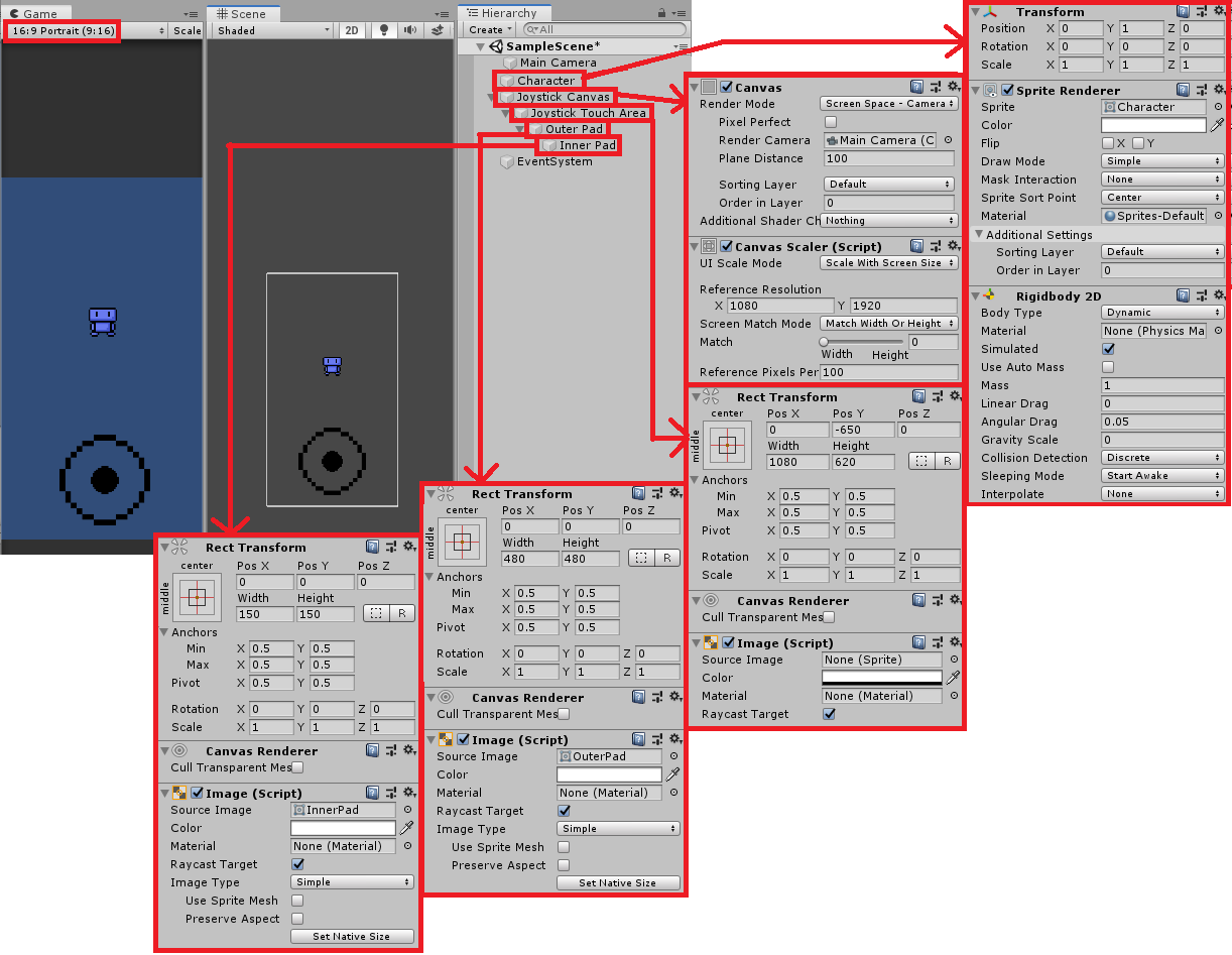제가 선택한 네모난 영역이 사용자가 터치할 영역이고, Inner Pad(안쪽 검은 원)는 사용자가 터치한 곳으로 움직일 것인데, Outer Pad(바깥 원)의 선까지만 움직이게 구현할 것입니다. 이와 동시에 조이스틱 방향으로 캐릭터가 부드럽게 회전하며 이동할 것입니다.