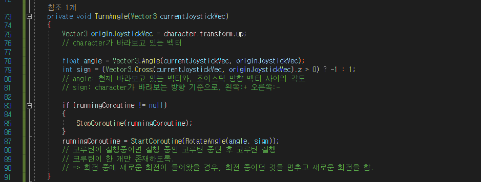 TurnAngle함수는 조이스틱의 벡터를 받아와, 캐릭터의 방향과 조이스틱 벡터 사이의 각도를 계산합니다. 그 후 RotateAngle이라는 코루틴을 호출합니다.