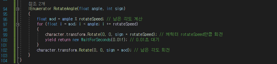 RotateAngle 코루틴은 angle을 rotateSpeed만큼 0.01초 간격으로 회전시키는 코루틴입니다. 이 코루틴을 적용하면 부드러운 회전이 적용됩니다.