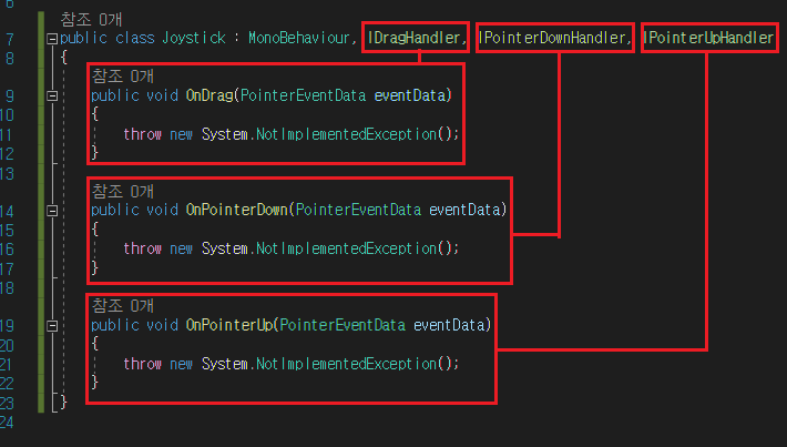 그리고 UnityEngine.EventSystems에 있는 IDragHandler 인터페이스, IPointerDownHandler 인터페이스, IPointerUpHandler 인터페이스를 상속받아줍니다.