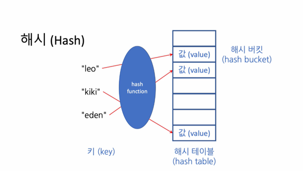 - 위의 그림에서 "leo"는 2번째 칸에, "kiki"는 7번째 칸에, "eden"은 3번째 칸에 사상 또는 매핑(mapping) 되었다고 표현합니다.