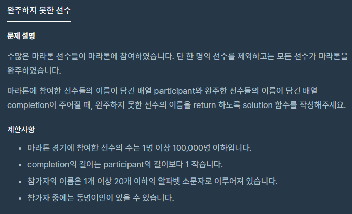 => 이 조건으로 유형이 달라집니다. 동명이인이 있을 수 있기 때문에, 어떤 특정한 이름의 사람 수를 세고 그 이름의 완주한 선수의 수와 비교해서 같으면 다 완주한 것입니다. 다르다면 그 이름을 가진 사람 중 한명이 완주하지 못한 것입니다.