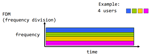 어떤 데이터를 보내는 주파수를 사용자에게 미리 정하는 것. 각 사용자가 특정 주파수로 보낼 것을 정한다. 주파수를 쪼개서 하나씩 주파수 자원을 나눠주는 것이다. 만약 4명의 사용자가 정해졌다면, 5번째 사용자는 못 듣는 것이다. 파란색 사용자는 파란 주파수를 사용해서 전화를 건다.