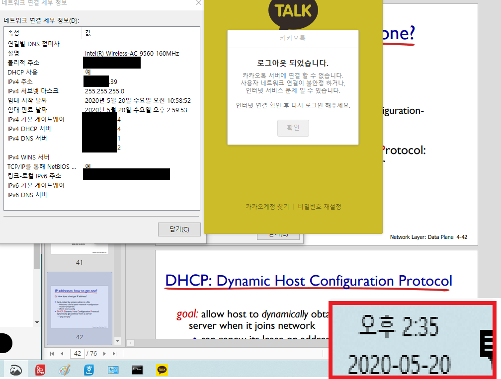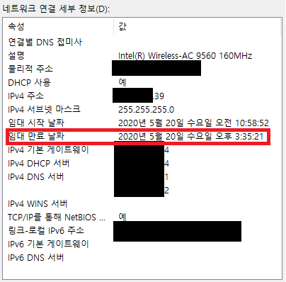 그런데 세부정보를 확인해보니, 와이파이가 끊긴 2:35에서 1시간 뒤인 3:35 으로 설정되어 있다. IP를 재임대를 하긴 한 것 같다.
