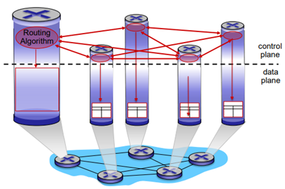 per-router contol plane은 각각 라우터들이 개별적으로 Routing Algorithm을 돌리면서 정보를 주고받는다. 그래서 각 라우터별로 control plane을 돌리는 것이다. forwarding table을 각자 계산해서 갖고 있는 것이다. Routing Algorithm이 메시지를 서로 주고받고 있는 것이다. 그래서 이 알고리즘을 토대로 forwarding table이 만들어진다.