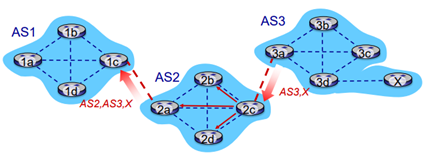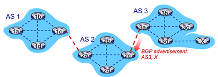 X라는 네트워크가 3d에 붙은 상황이다. 그러면 3d는 X하고 붙었다고 iBGP를 통해서 내부에 broadcast한다. 3a가 이를 받고, 3a는 2c에게 AS3는 X하고 연결되어 있다고 알려준다. (AS3,X) 즉, 3a는 2c에게 X로 데이터를 forward할 수 있다고 약속하는 것이다.