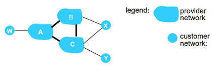 B는 BAw라는 것을 C한테 알려줄 수도 있는데, 이것을 advertise하지 않도록 정할 수 있다. B는 B의 customer만 서비스해주면 되는데, 내가 왜 남의 customer까지 라우팅 해 줄 필요가 없다는 policy를 가질 수 있다. 그래서 이 policy에 의해서 B는 전파를 하지 않는다.