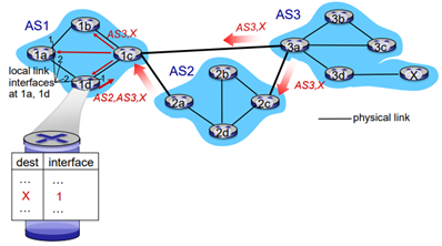 AS1에서 AS3로 가는 길이 있는 경우. 1c 입장에서는 X로 가는 경로를 AS2와 AS3로부터 받아 X로 가는 경로가 두개가 있다. AS2와 AS3로부터 정보를 받았다. 둘 중에 어느 경로로 보낼까? 1c는 어떤 경로를 선택해서 iBGP를 통해 내부에 알린다. 자세한 것은 뒤에서 배운다.
