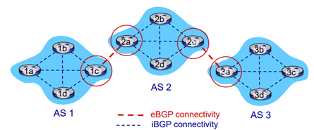 1c - 2a 와 2c - 3a 가 서로 메시지를 주고 받아서 연결을 만들었다. 이웃 AS간에 연결이 만들어졌는데, 이것을 만드는 것이 eBGP에서 하는 것이다.