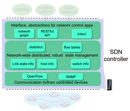 하드웨어 switch 위에는 SDN controller가 있다. 이 controller는 network OS로 생각하면 된다. Network에 대한 상태정보를 갖고 있다. 그래서 실제 application들과 SDN-controlled switches들의 중간역할을 하게 된다. 그래서 SDN controller는 각각 분산적으로 구현이 된다. performance, scalability, fault-tolerance 등을 해결하기 위한 역할을 한다.