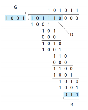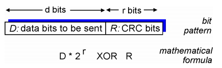 R이라고 하는 CRC bits가 붙는다. 이 CRC bits를 잘 encoding을 하게 되면 앞의 D에 error가 있는지 없는지 잘 detection을 할 수 있게 된다. 일단 보내는 쪽과 받는 쪽은 pattern G라고 하는 것을 알고 있다고 가정해보자. 그래서 D+R이라고 하는 정보. 이진수를 pattern G로 나눌려고 한다. 나눗셈을 했을 때 그렇게 했을 때 나머지가 나오는데 나머지 정보를 찾아서 정보를 집어넣으려고 하는 것이다.