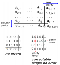 two-dimensional bit parity는 좀 더 개선한 것이다. 행렬의 형태로 구현하였다. 이것은 1의 개수가 짝수개가 되도록 한다. 수신 쪽에서 이 행렬을 분석해서 error를 찾을 수 있다. 그리고 바르게 correct도 할 수 있다. 그러나 error가 두개 이상일 때 동작이 안된다.