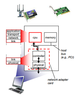 유선인 경우 Ethernet card, 무선인 경우 802.11 card이다. adaptor는 NIC 라고도 불린다. NIC가 대체로 CPU하고도 통신해서 data를 처리하는 것을 관리하게 된다.