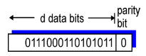 EDC를 구현하는 가장 간단한 방법이다. 보내려고 하는 d만큼의 data bits가 있고, 뒤에 parity bit라고 하는 한 개의 bit를 추가하여 전체 1의 개수를 세서 홀수개가 되도록 조절하는 것이다. d data bits의 1의 개수가 홀수면 0. 짝수면 1. 이것은 홀수개의 error가 발생했을 때만 찾을 수 있다.
