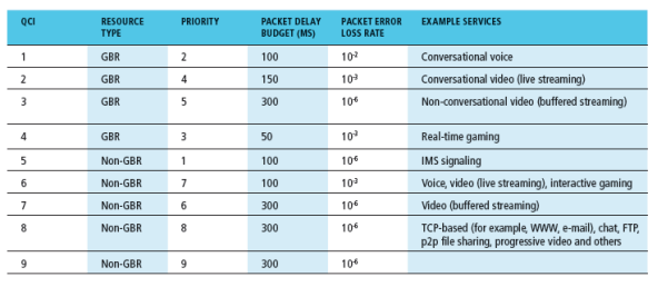 그래서 voice를 우선순위가 높게 할당한다. IMS란 전화를 걸 때 signal이다. 표를 보면 전화를 걸 때 우선순위가 가장 높고, 음성이 그 다음이다. 앞서 나왔던 eNodeB(기지국)이 무선구간을 관리해야 하는데 무선구간이 제일 bandwidth가 작기 때문에 속도나 딜레이 이슈가 생긴다. 그래서 기지국에서 QoS를 관리해주기 위해서 스케쥴링 해준다. 9개의 QoS index를 만들어서 관리를 하는 것이다.