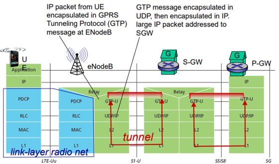 그리고 eNodeB와 S-GW 사이에서 데이터를 보내는 통신에서 L1, L2가 있고 UDP/IP가 들어가는데 이 UDP/IP는 둘 간의 통신을 위해서만 써주는 것이다. 인터넷 바깥으로 나갈 목적은 아니다.
